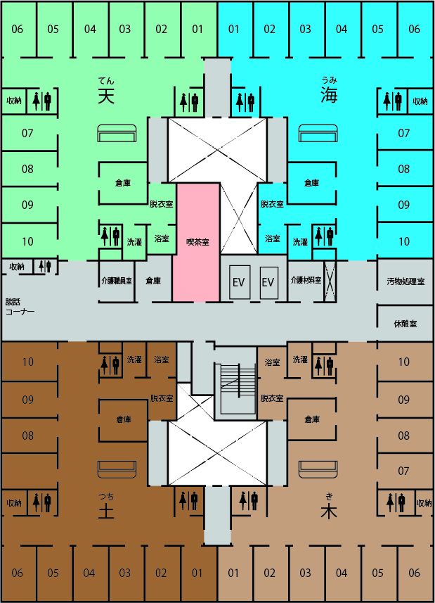 2階・3階の居室は全て個室です。1ユニット10部屋で1つの生活単位となっており、それぞれに浴室やキッチン、リビングスペースがあります。2階の4ユニットのうちの1つ(水ユニット)はショートステイ専用となりますので、ご自宅で生活されている方が、短期でご利用することができます。